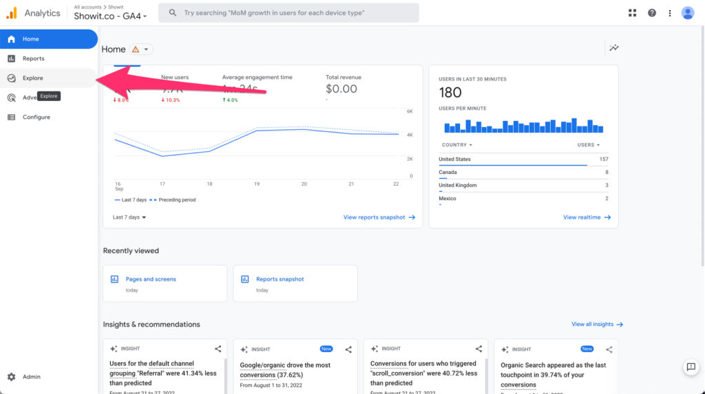 When you're logged into analytics, scroll over the icons on the left-hand side of the screen and find the “Explore” option.