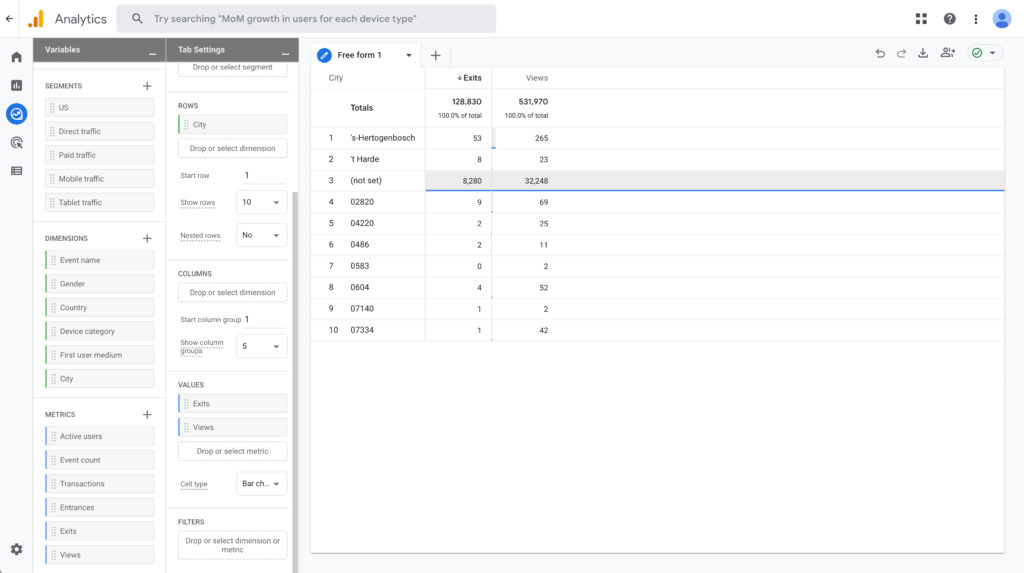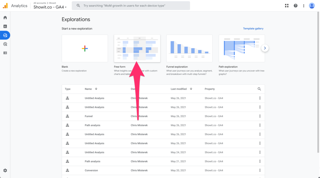 We're going to create a new “Free Form” exploration which just means we're going to be telling Google what we are looking for specifically.