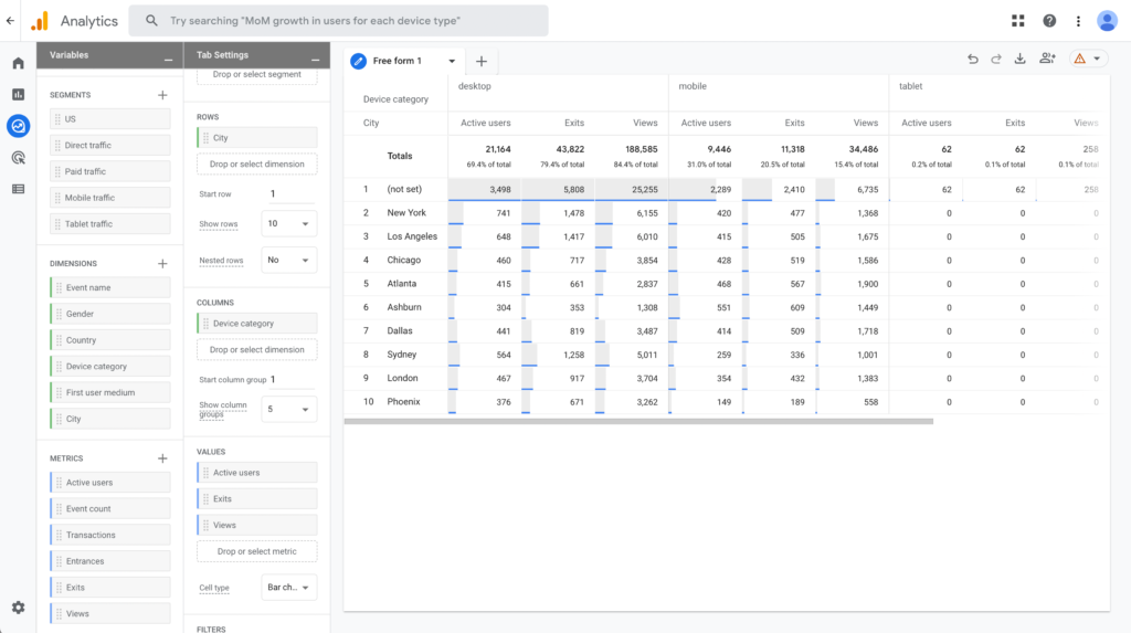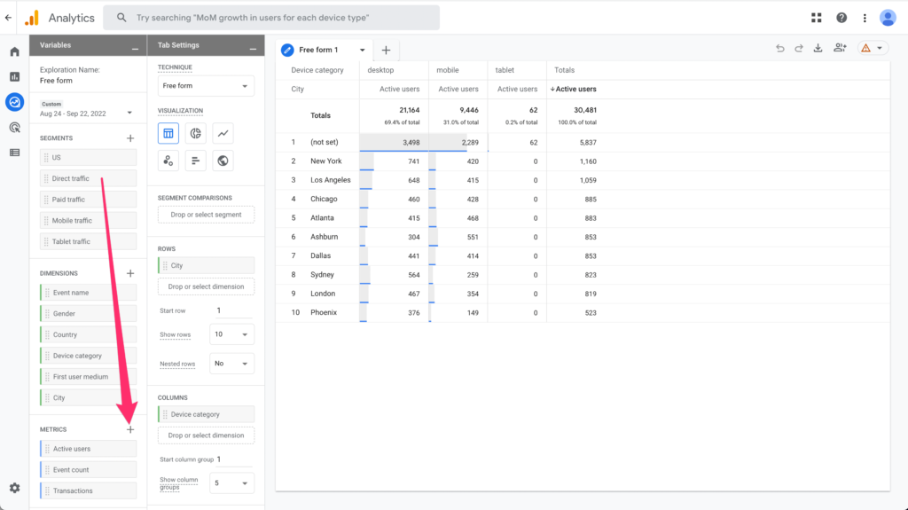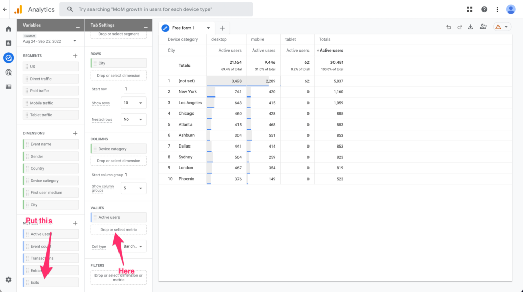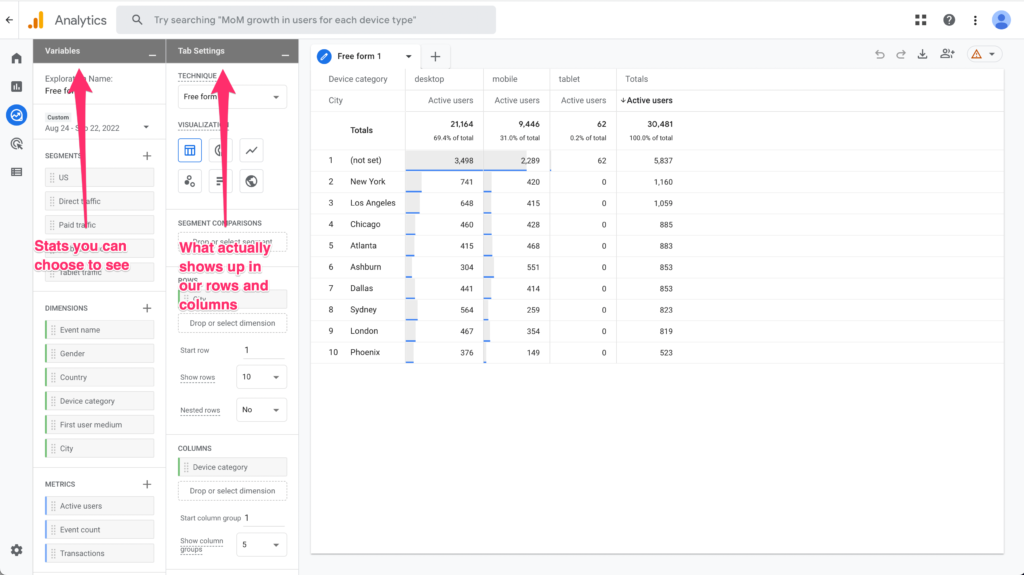 Let's get rid of the Active Users Value and Device Category in the columns.