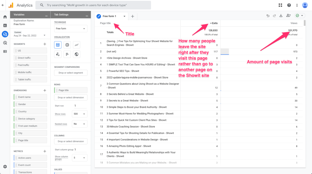 We've got a list of our most visited pages along with how many people are leaving Showit right after they visit that page. So, what we are looking for is a mix of a lot of Views with a small number of exits.
