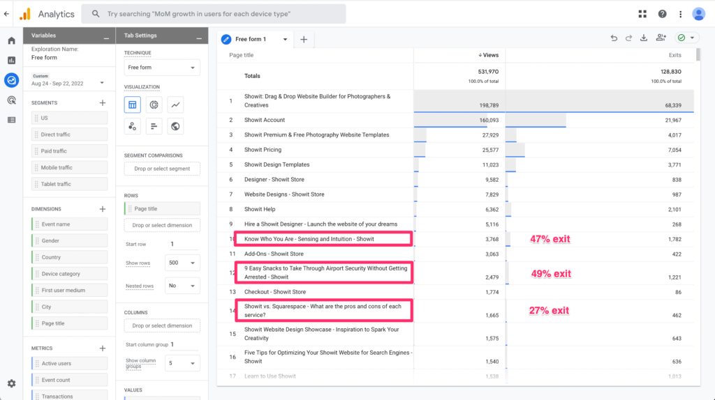 In the next image, I highlighted 3 of the most visited “blog” like pages on the Showit site. Let's see what we can find out from it.