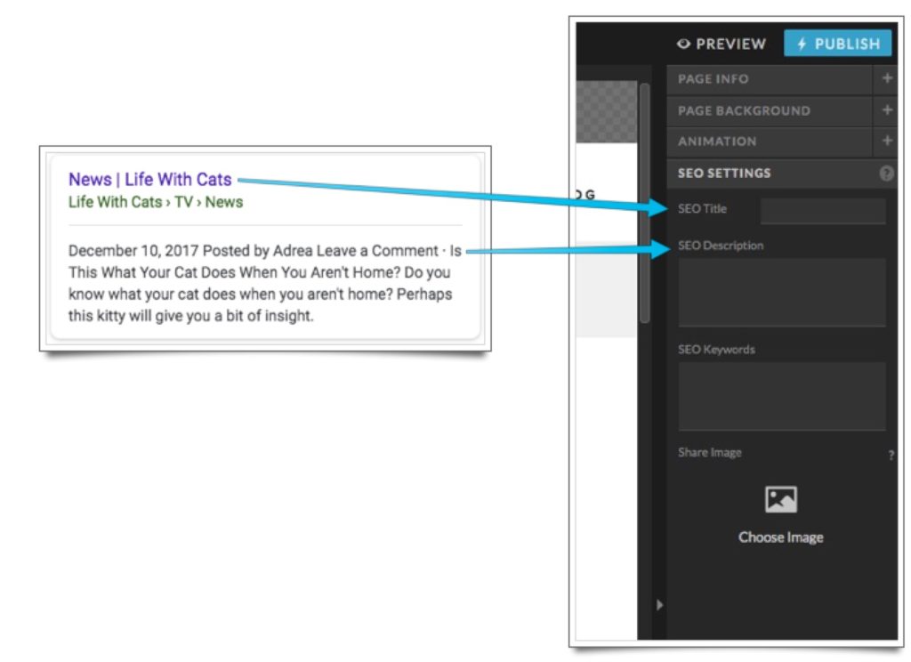 When you create a page with Showit, there are straightforward fill-in-the-blank places where you can add an SEO title and description (also known as a meta-description). A page’s title and meta-description should contain the keywords your page is trying to target. Most importantly, this provides context about your page for website visitors, but it also indicates to search engines what your page is about.