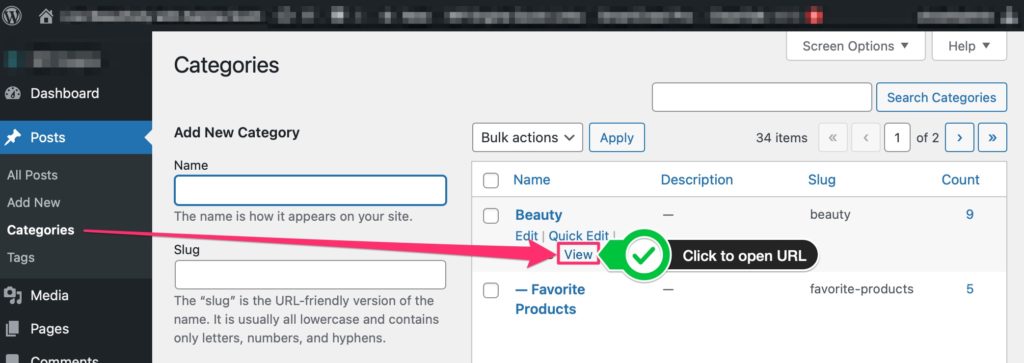 Once you’ve added category links to your page the next step is to make sure you link to the correct URLs. On the Showit platform you will blog via WordPress. To get the correct URL for each category, you’ll need to login to the WordPress admin and go to Posts > Categories section.
