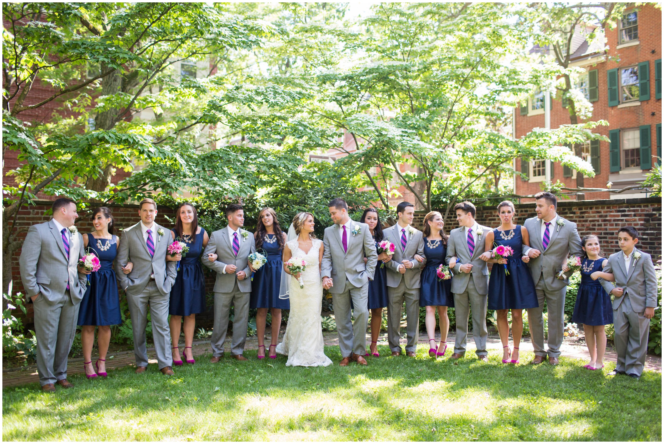 2pm in Philly, and having to shoot a huge bridal party in full sun. We found a small area where there was enough shade. The area was large enough for them to stand in a small semi-circle formation. This patch of shade on the grass had the full sun hit them in front and behind. Then, I stood in the next patch of full shade created by the stump of the tree. Again, it also helps to be as short as I am in these situations.”